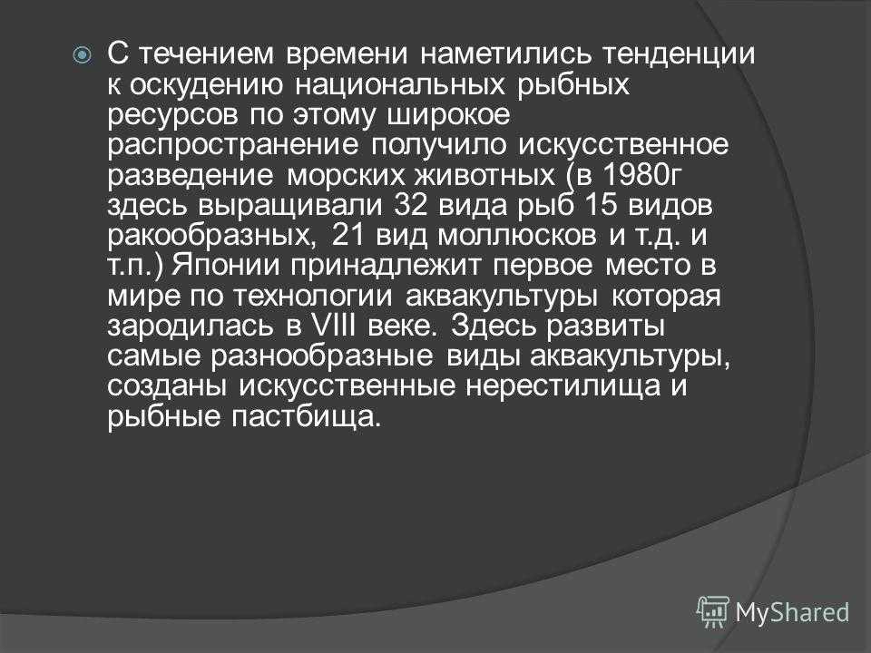 С течением времени наметились тенденции к оскудению национальных рыбных ресурсов по этому широкое распространение получило искусственное разведение морских животных (в 1980г здесь выращивали 32 вида рыб 15 видов ракообразных, 21 вид моллюсков и т.д. и т.п.) Японии принадлежит первое место в мире по технологии аквакультуры которая зародилась в VIII веке. Здесь развиты самые разнообразные виды аквакультуры, созданы искусственные нерестилища и рыбные пастбища.