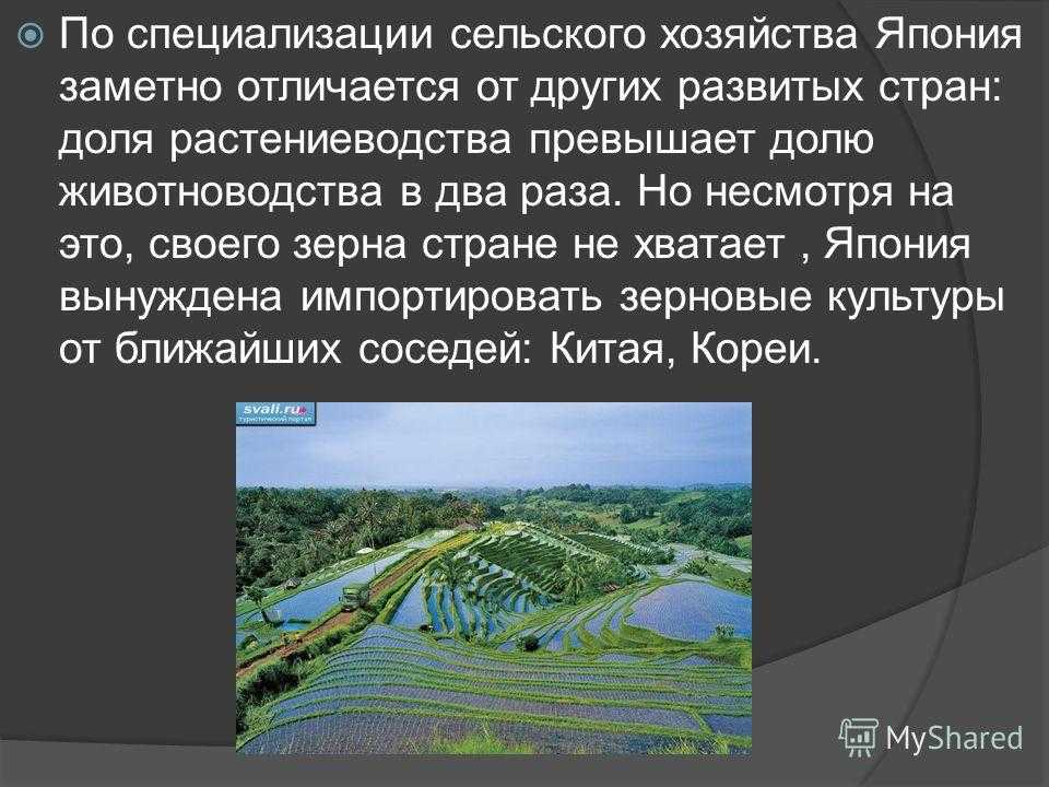 По специализации сельского хозяйства Япония заметно отличается от других развитых стран: доля растениеводства превышает долю животноводства в два раза. Но несмотря на это, своего зерна стране не хватает, Япония вынуждена импортировать зерновые культуры от ближайших соседей: Китая, Кореи.