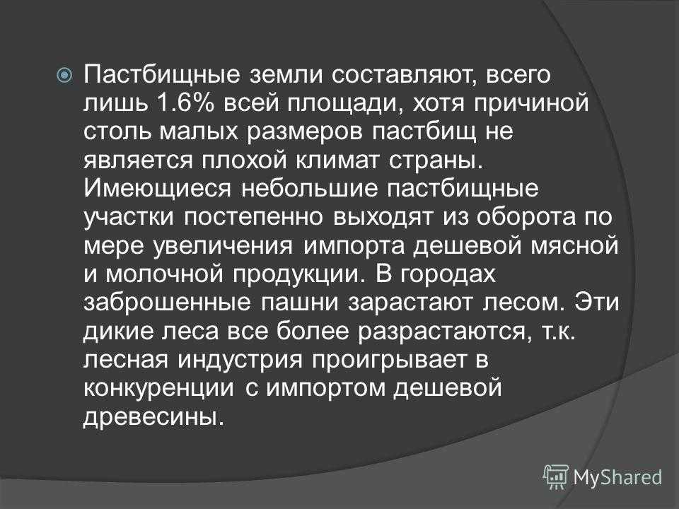 Пастбищные земли составляют, всего лишь 1.6% всей площади, хотя причиной столь малых размеров пастбищ не является плохой климат страны. Имеющиеся небольшие пастбищные участки постепенно выходят из оборота по мере увеличения импорта дешевой мясной и молочной продукции. В городах заброшенные пашни зарастают лесом. Эти дикие леса все более разрастаются, т.к. лесная индустрия проигрывает в конкуренции с импортом дешевой древесины.