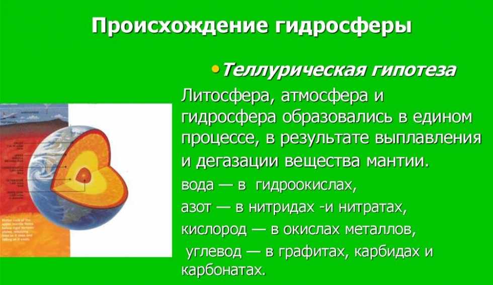 Существует 2 основных теории происхождения гидросферы — теллурическая и космологическая.