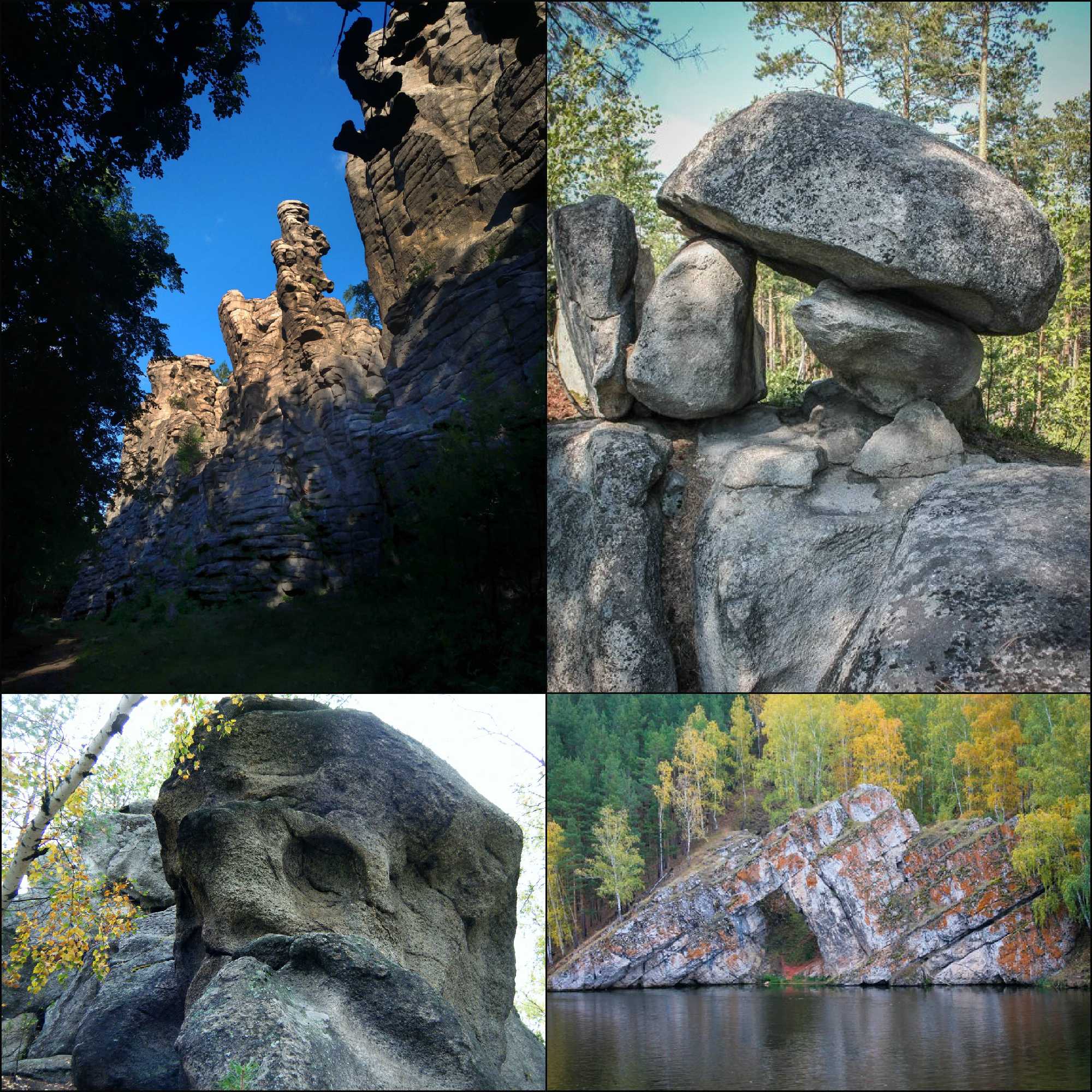 Так, одну из самых знаменитых форм выветривания (в простонародье именуемую «блинчиками») можно увидеть на скалах Семь Братьев (рядом с посёлком Верх-Нейвинский). Они напоминают сложенную из огромных каменных плит стену с характерными «башнями».