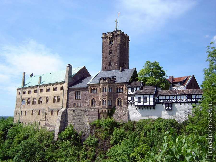 Последним древним сооружением Германии, о котором мы хотим вам сообщить, является замок Вартбург. Расположен он в Тюрингии (земля ФРГ), на склоне горы над обрывом в 441 м над морем, так что оттуда можно увидеть еще и очень красивые виды — на карте также присутствует.. С 1999 года здание находится в списке Всемирного наследия ЮНЕСКО.