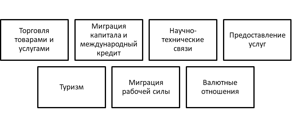 Старейшей и наиболее широко распространенной формой реализации МЭО выступает международная торговля. В наиболее общем смысле под ней следует понимать систему международных товарно-денежных отношений в сфере обмена сырьем, товарами и услугами, состоящую из внешней торговли всех государств мира. Помимо международной торговли активно развиваются валютно-финансовые отношения.